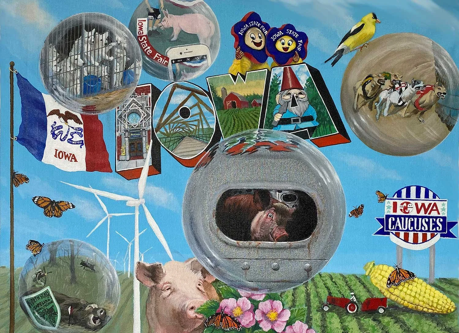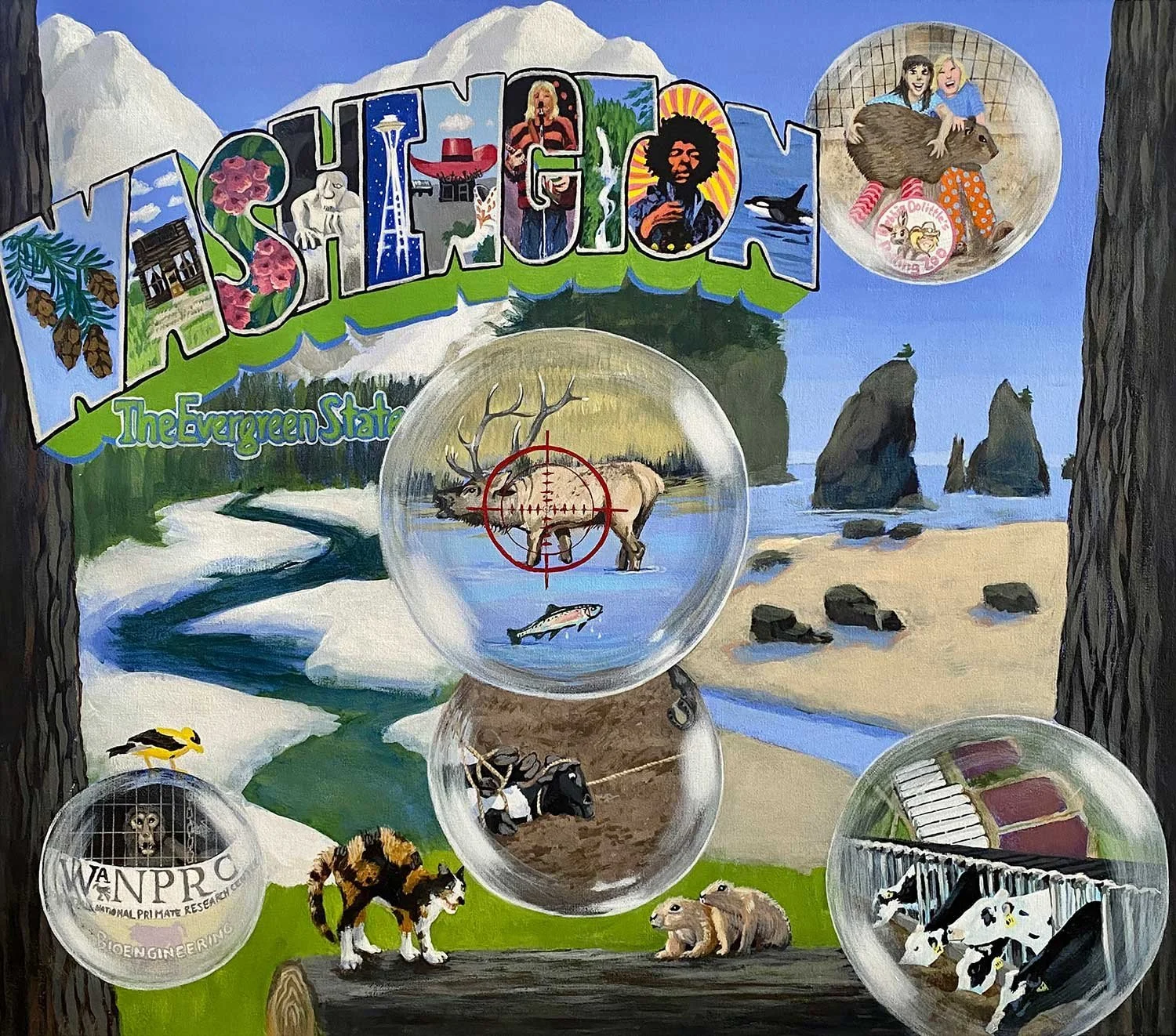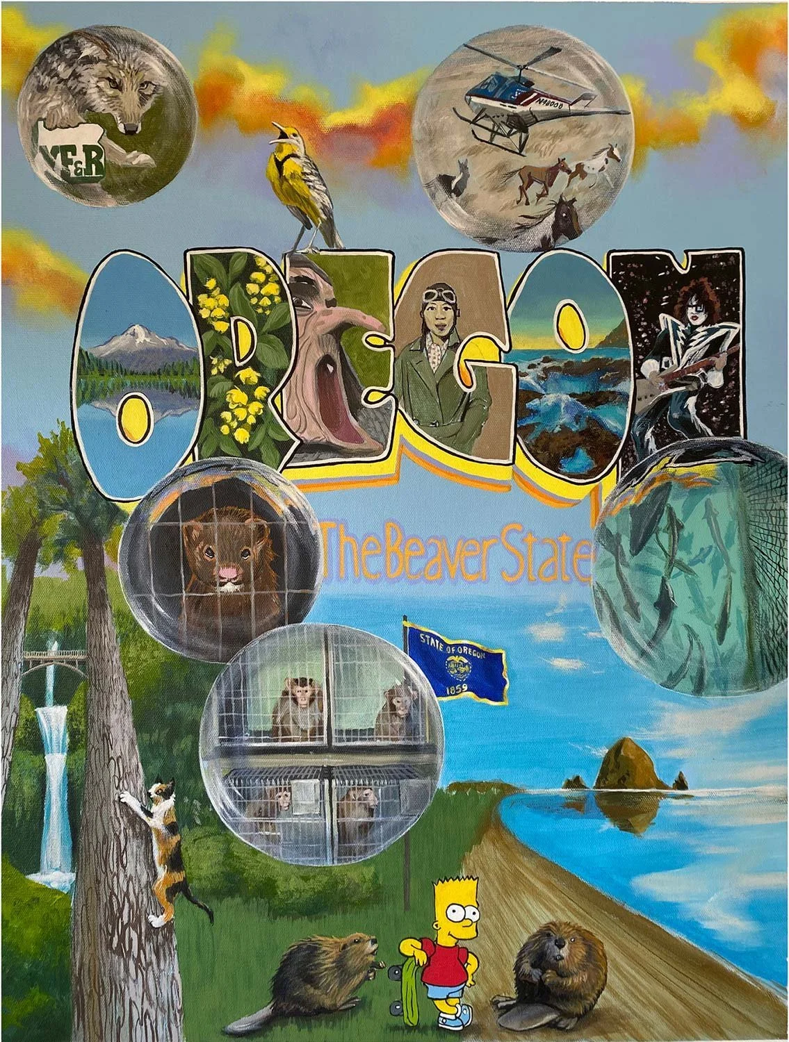 State of the Union – Animals Across America is an exhibition by artist and animal advocate Jane O’Hara that explores animal rights across the United States. Drawing inspiration from nostalgic postcard imagery, pop culture references, and the realities of animals both in plain sight and behind the scenes, O’Hara presents a thought-provoking look at all 50 states. Through a blend of humor and seriousness, the exhibition challenges viewers to consider the contrast between how animals are symbolized and how they are actually treated in our society.