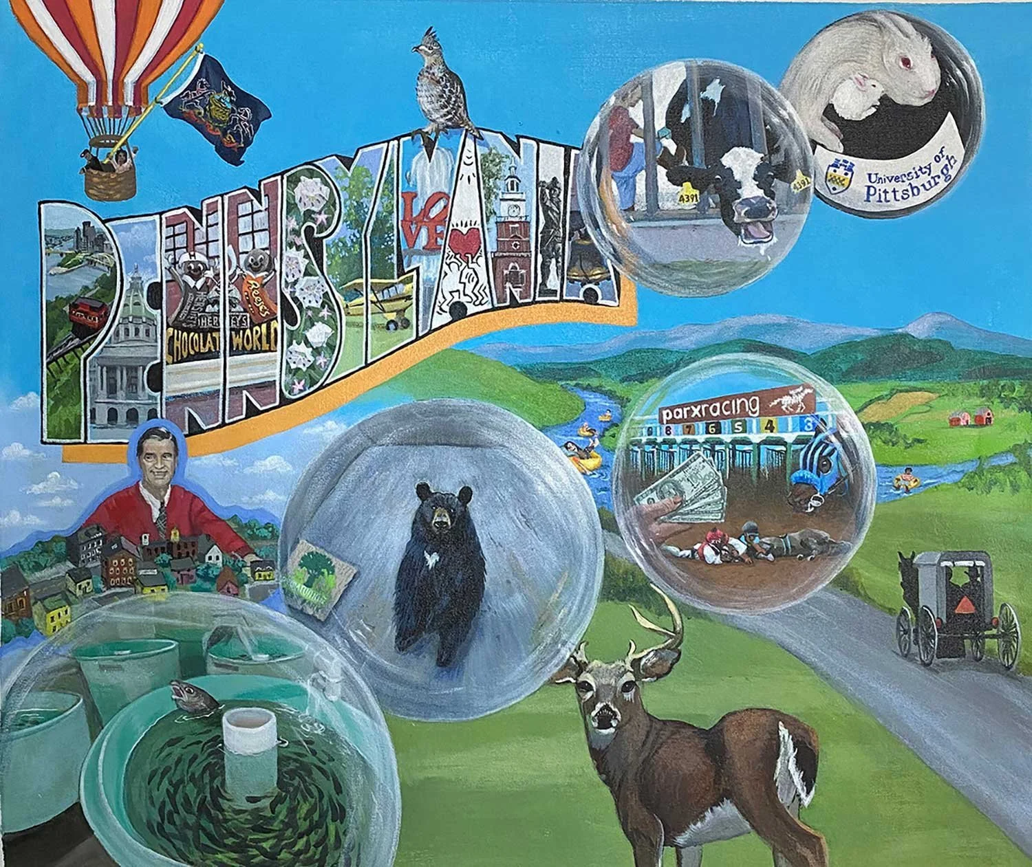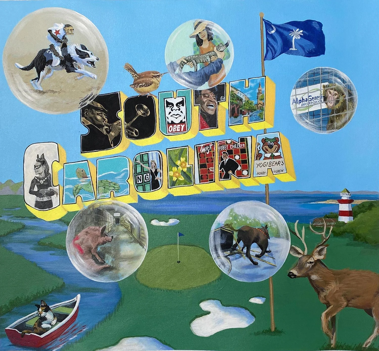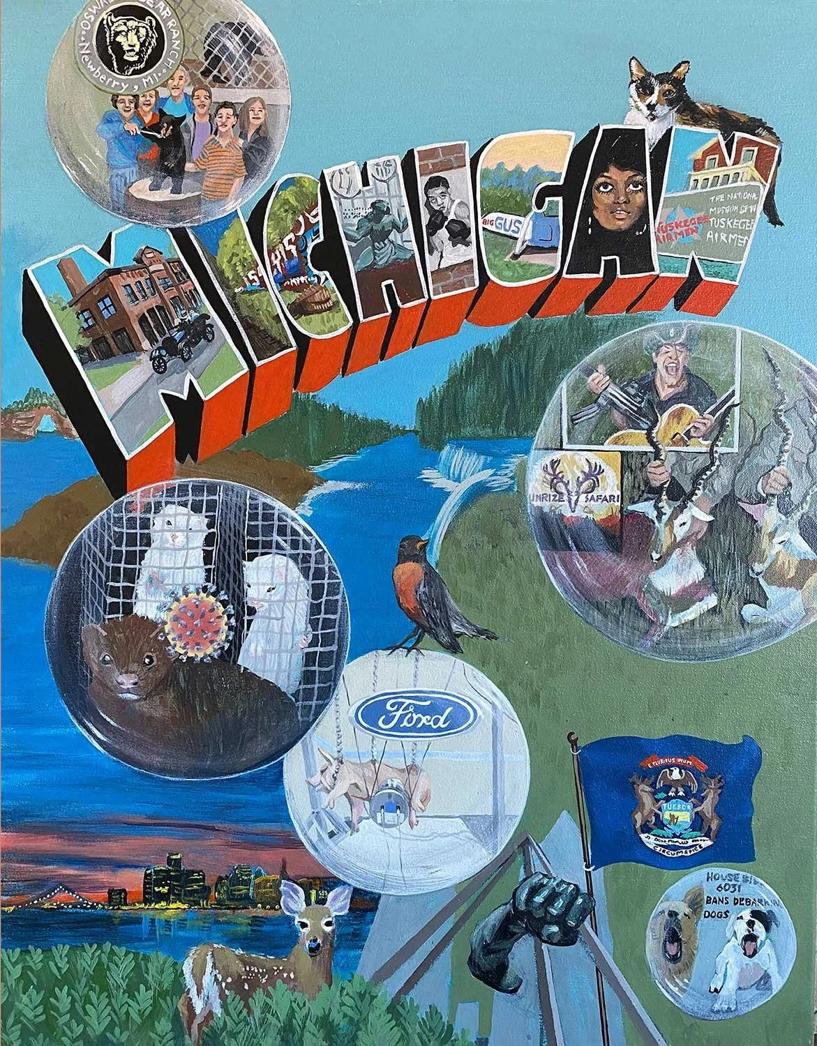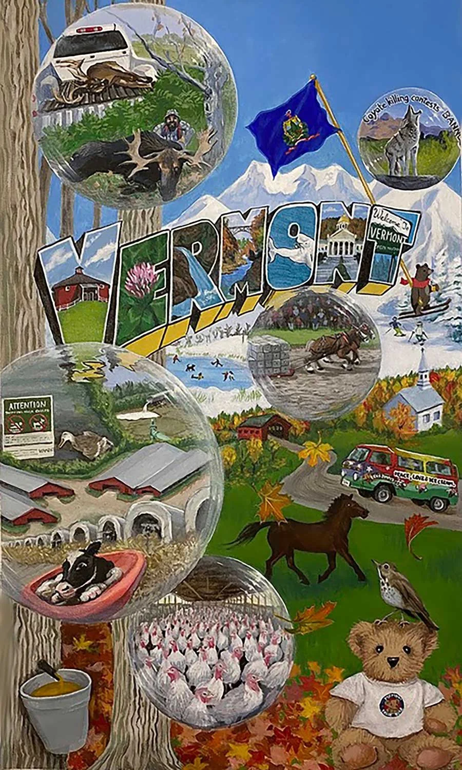 State of the Union – Animals Across America is an exhibition by artist and animal advocate Jane O’Hara that explores animal rights across the United States. Drawing inspiration from nostalgic postcard imagery, pop culture references, and the realities of animals both in plain sight and behind the scenes, O’Hara presents a thought-provoking look at all 50 states. Through a blend of humor and seriousness, the exhibition challenges viewers to consider the contrast between how animals are symbolized and how they are actually treated in our society.